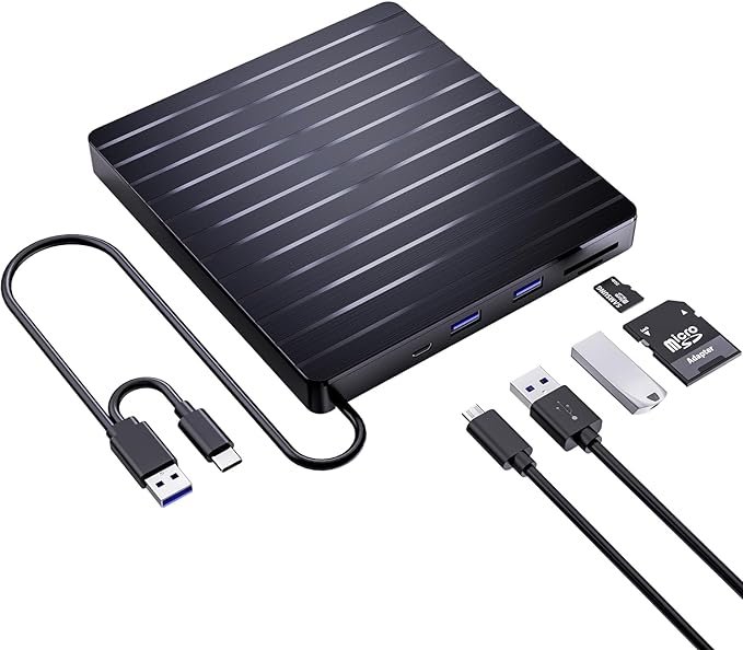 La unidad de DVD externa 5 en 1 de SENKUTA ofrece USB 3.0 y tipo C dual, ranura SD/TF independiente y 2 puertos USB. Transmisión rápida de hasta 5.0 Gbps, plug and play, compatible con una amplia gama de dispositivos. Ideal para grabación y reproducción.